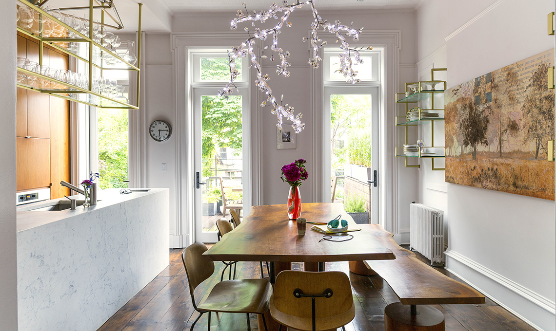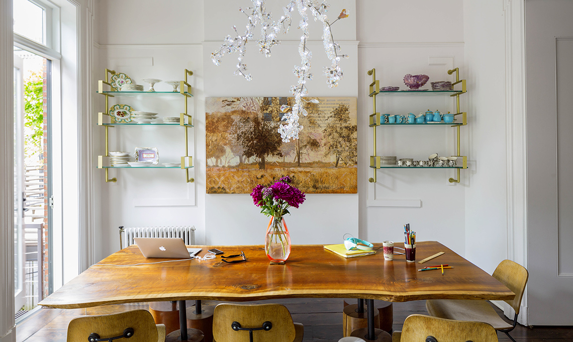 Il bello è multiforme e imprevedibile. «È come girare per le strade di New York... non sai mai se dietro l’angolo troverai un graffito o un palazzo decorato. E la magia è proprio il mix fra queste cose». Mescolare pezzi di valore e stile diversi è stata anche la parola d’ordine nell’arredare questa casa: la cucina costruita con legno di riciclo; le mensole in vetro e ottone copiate al mercato delle pulci di Parigi; il divano comprato su eBay. E insieme, sul tavolo da pranzo, il prezioso chandelier del designer olandese Tord Boontje: «L’ha trovato Tamra», dice Mike con gli occhi che brillano, «è il più bello che abbia mai visto!».