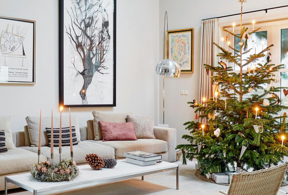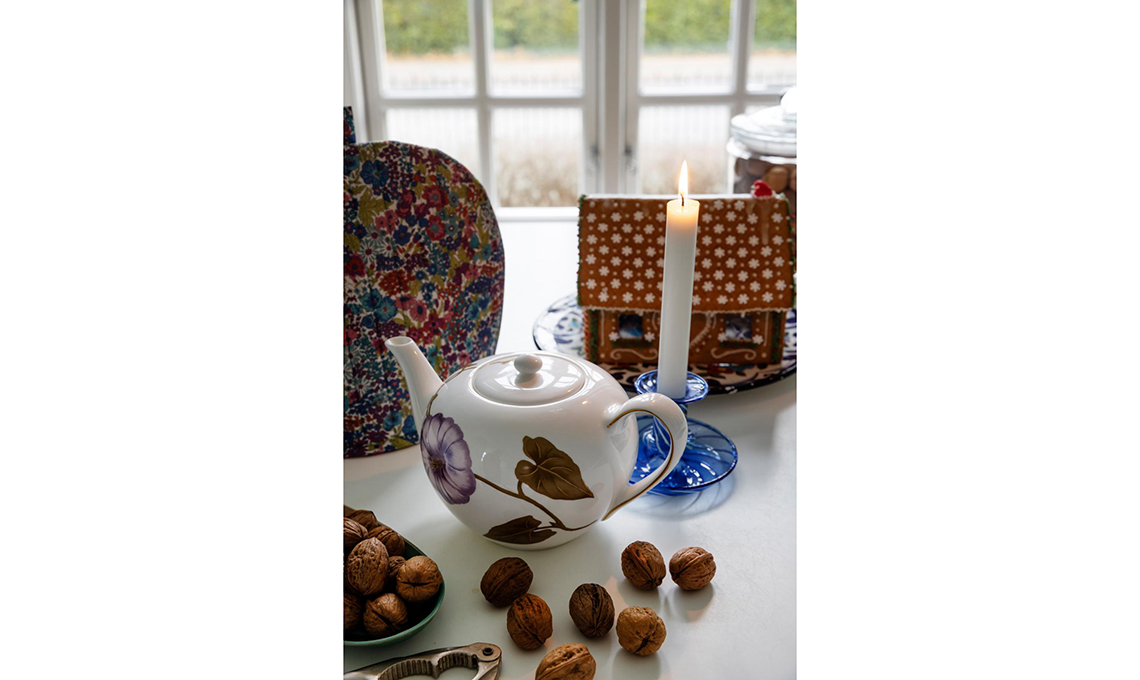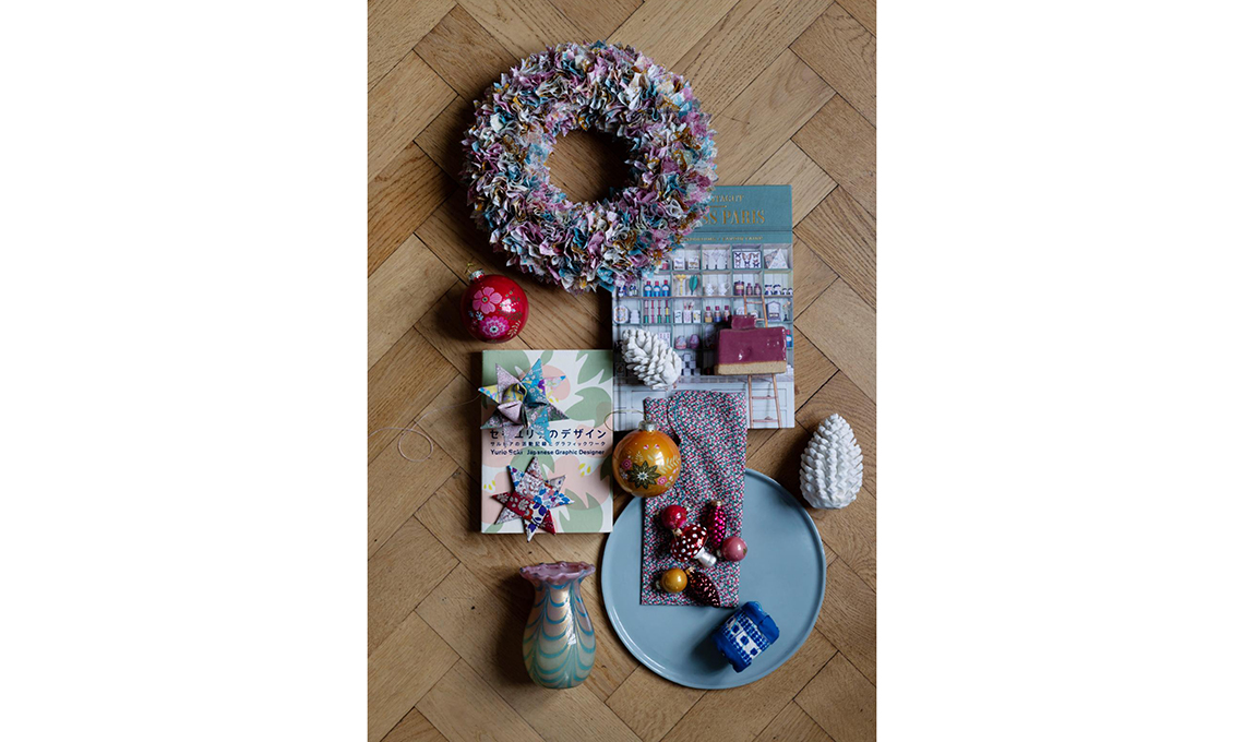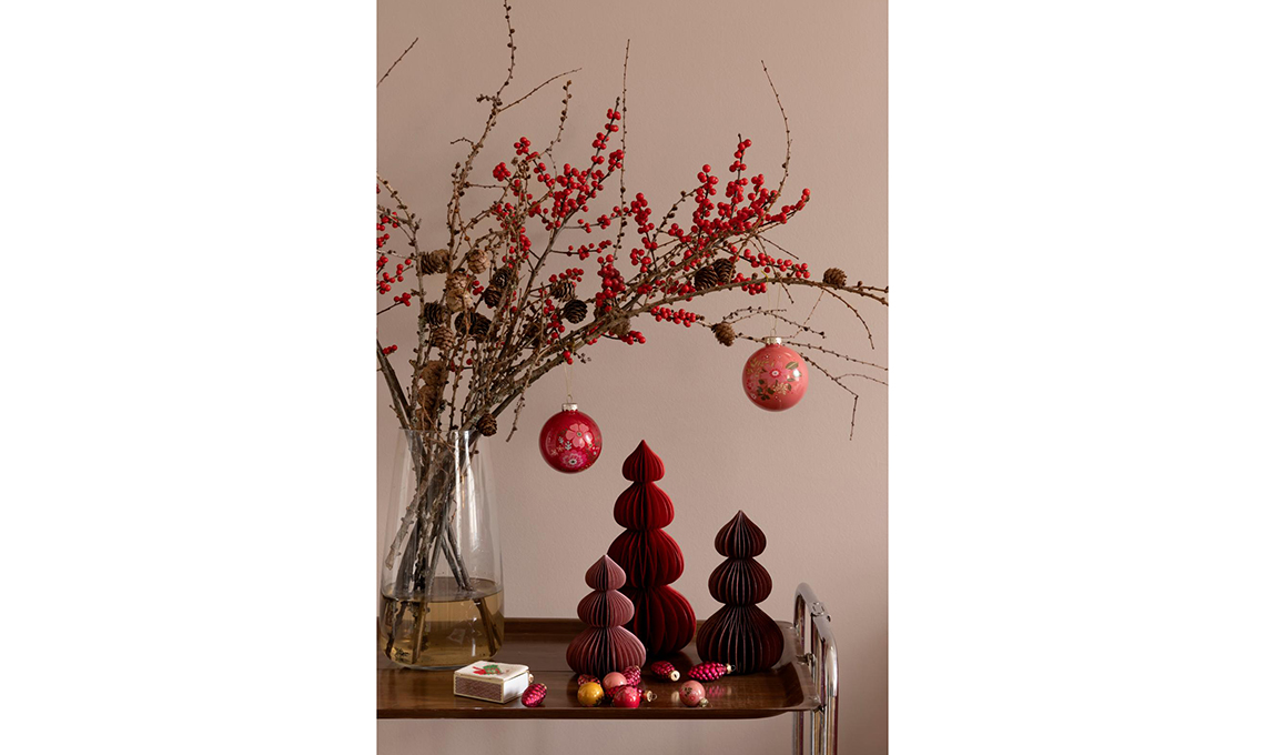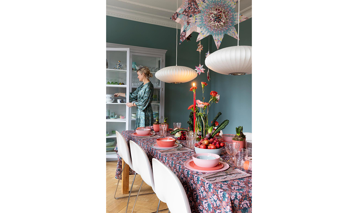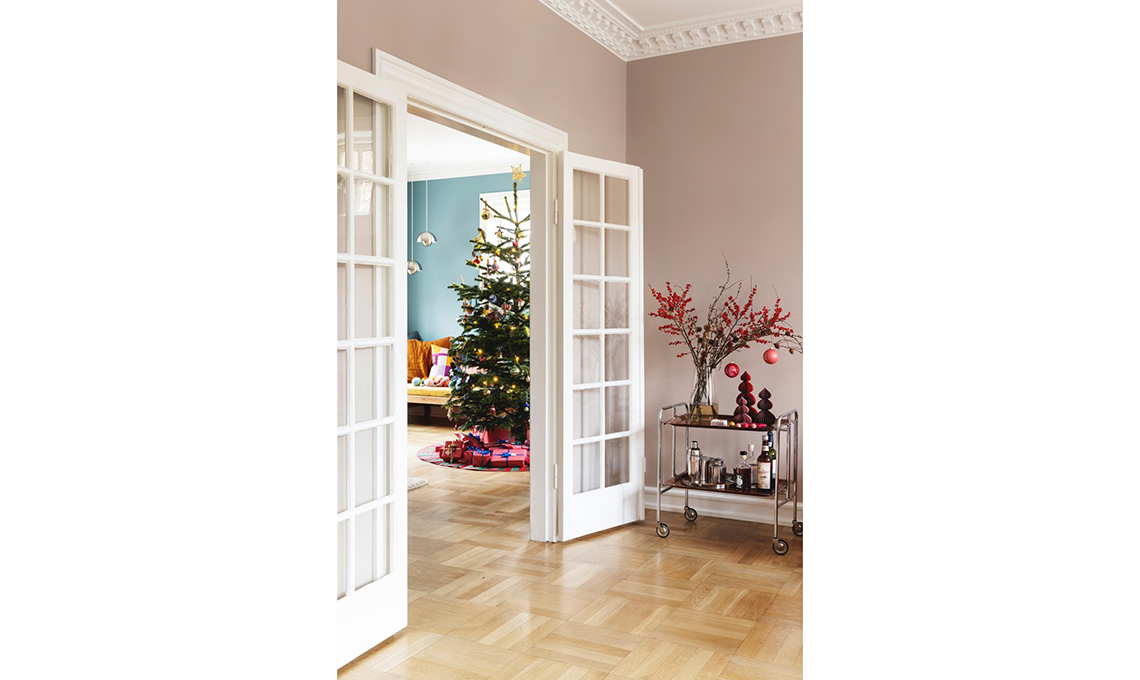 Sono allestite qua e là sui tavolini vintage le decorazioni natalizie realizzate da Rikke nei toni del ciclamino, bordeaux e rosa antico.
