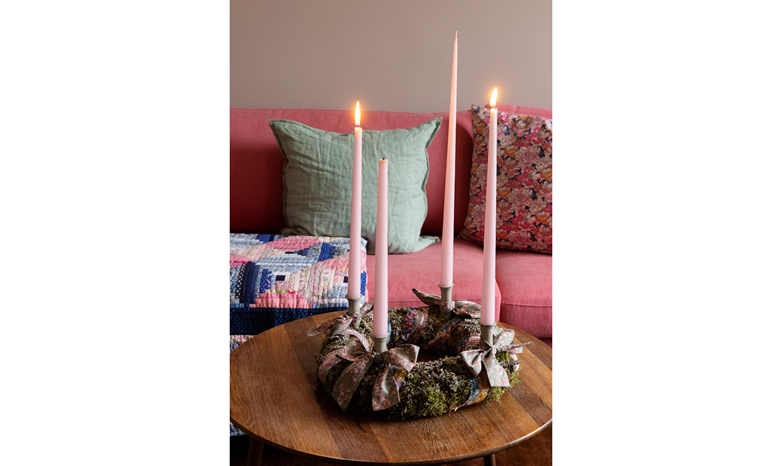 Cuciti in maxi fiocchi, addobbano la tradizionale ghirlanda dell’Avvento di rami e muschio.