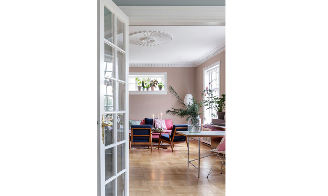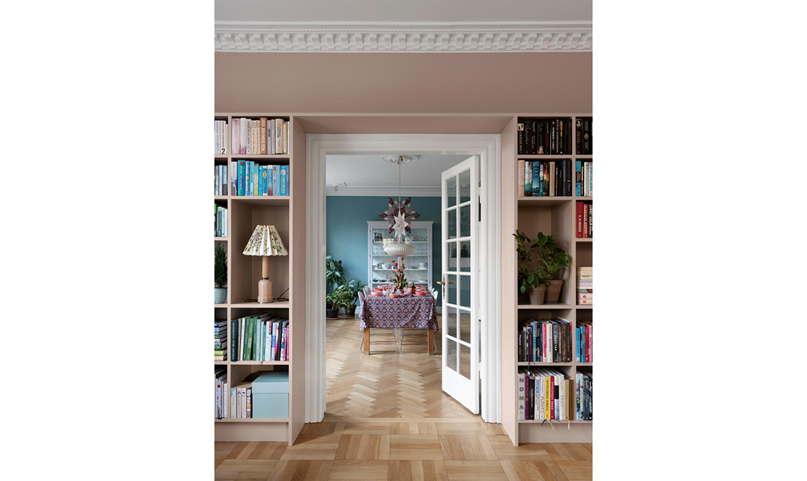 Incornicia l’affaccio sulla sala da pranzo la libreria su misura, dipinta rosa cipria come la parete. Tra i libri, protagonista la lampada Heiberg, icona danese Anni ’60.