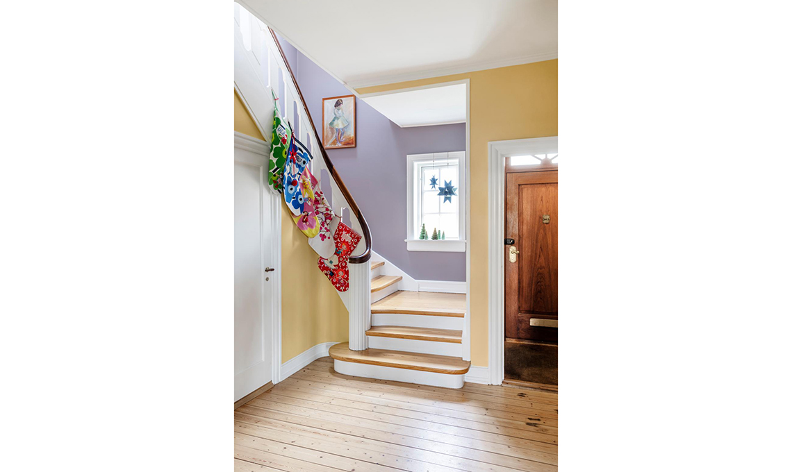 gli iconici tessuti di Marimekko le calze per i doni appese, come da tradizione, alla scala.