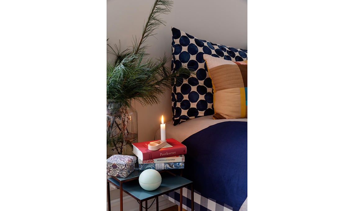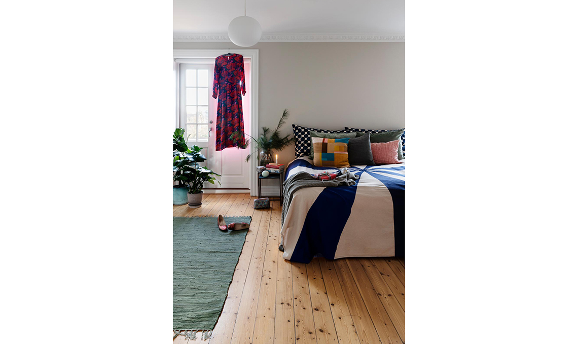 Mix di pattern e colori senza regia per il letto con copriletto circus e un potpourri di cuscini cuciti da Rikke con avanzi di velluti e di tessuti d’arredo. Fanno da testata due maxi cuscini neri a pois. Fa da sfondo la palette neutra della casa, con il parquet miele a listoni, le pareti grigio perla e il bianco di infissi e modanature. Minimal anche il comodino, ‘risolto’ con