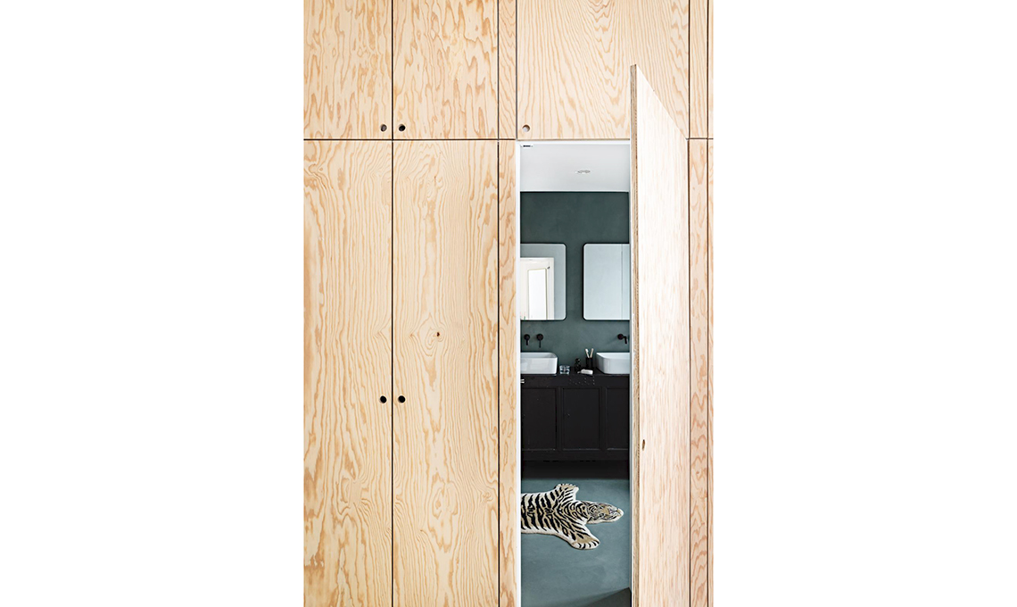non interrompe visivamente la composizione dell’armadio, realizzato da un artigiano in multistrato di betulla (tipiche rétro, le maniglie ricreate con un semplice foro da