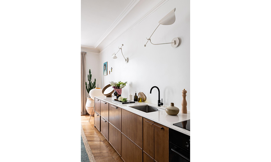 L’architetto Bertille Borja reinventa i metri quadrati inserendo la cucina nel soggiorno che ospita anche la sala da pranzo: tutta a vista,