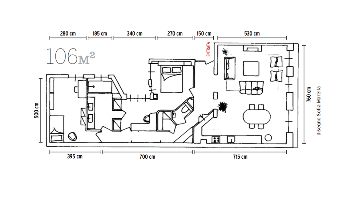 3 cm circa). Il bagno, a destra, è l’unica stanza ‘dark’ che gioca con una sobria eleganza. Molto bella