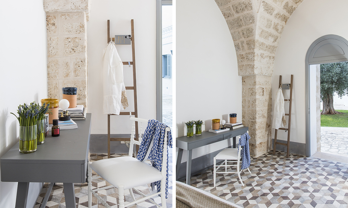Un morbido grigio sporco d’azzurro arricchisce la masseria. Qui veste lo scrittoio Gray 50 [Gervasoni, cm 130x45x75h da €1.364] e appare negli accenti