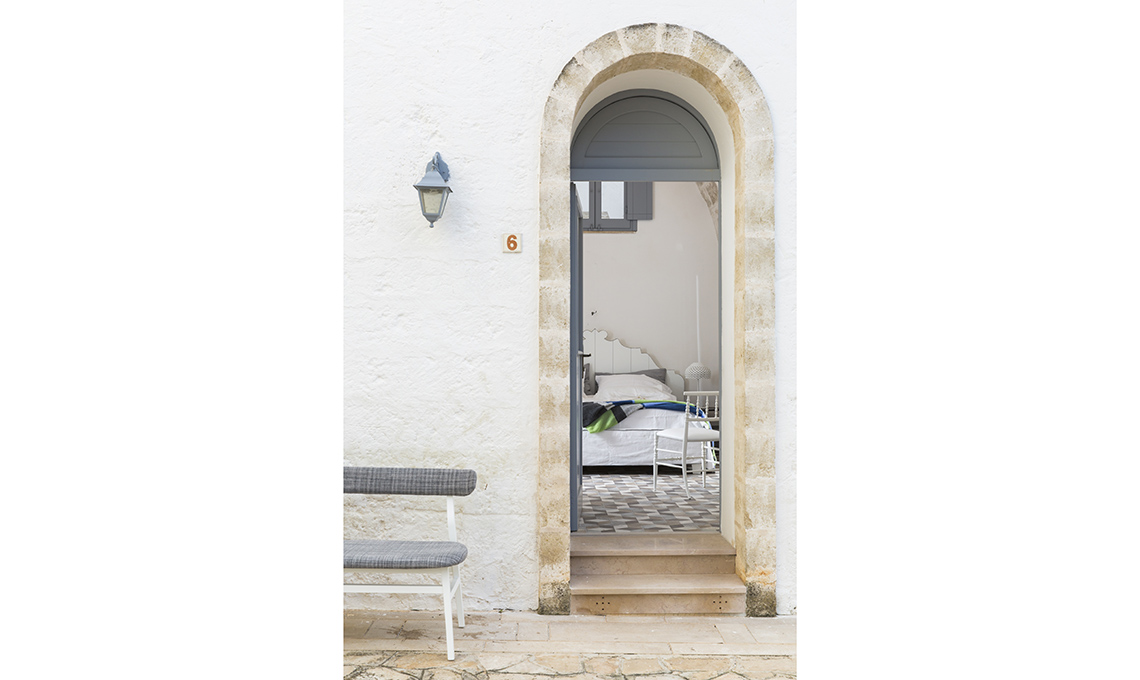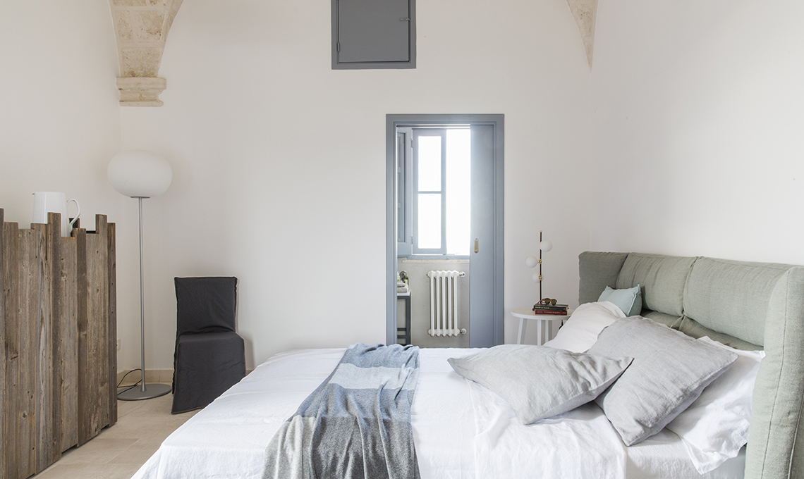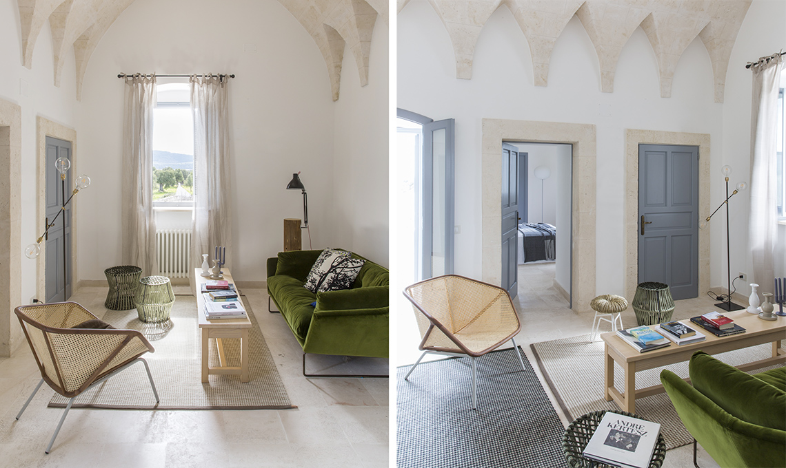 Le peculiarità architettoniche che impreziosicono la struttura seicentesca, come le porte dall’ampiezza e dalla disposizione inusuale, si risolvono in spunti di stile freschi ed eleganti insieme, decisamente distanti dalle convenzioni di molte abitazioni contemporanee. Incrociando attente scelte cromatiche al generoso ingresso della luce naturale, la nostra stylist ha ritagliato un angolo relax di charme, pur conservando immutata la leggerezza estiva e delicata che permea ogni angolo di questa masseria.