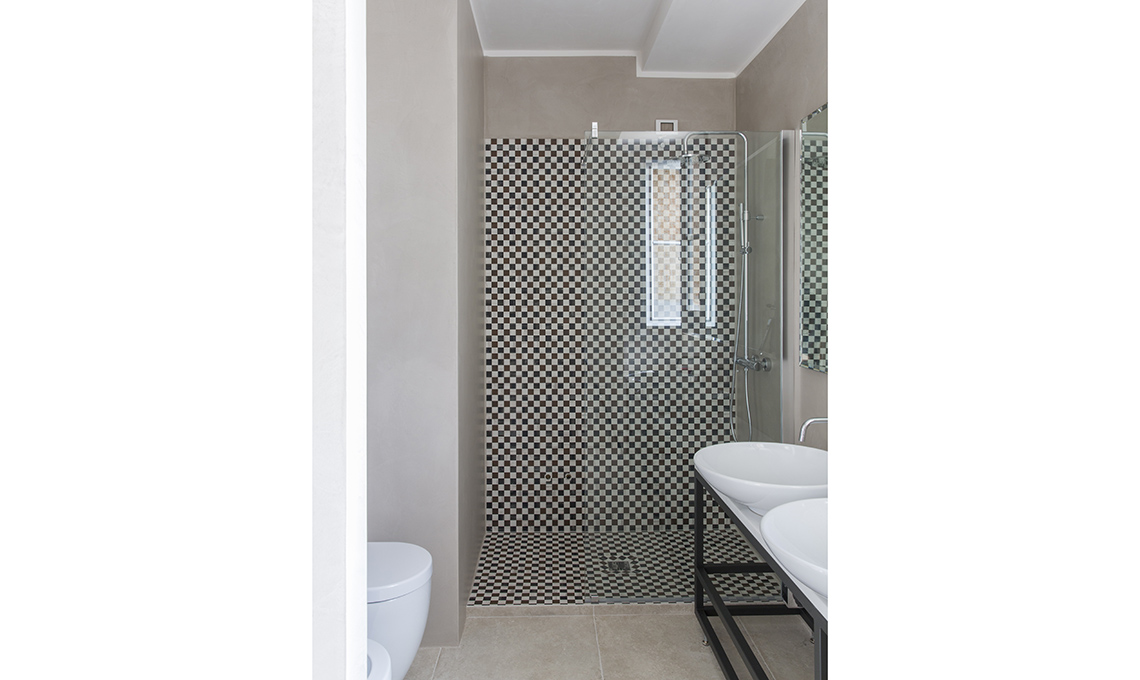 La doccia colpisce per la grafica serrata e d’impatto delle piastrelle Cementine 20 in grès porcellanato [Fioranese], che esprimono bene il gusto per la storia.