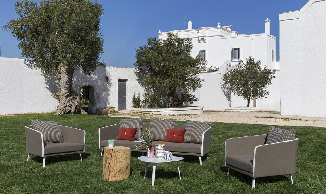 elettrico, a contrasto con la palette della terra pugliese. Per il caffè, i tavolini Cleo e Milo [da €1.044 e da €322]. Tutto [Talenti]. Qui all’esterno, i tappeti Bardot tinta unita e Herta a righe [Kasthall, da €1.900 e da €3.000] sono inattesi e riusciti.