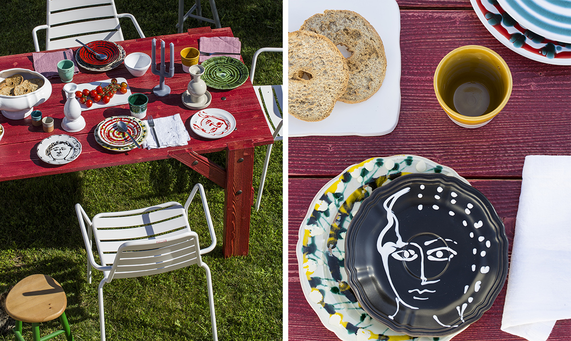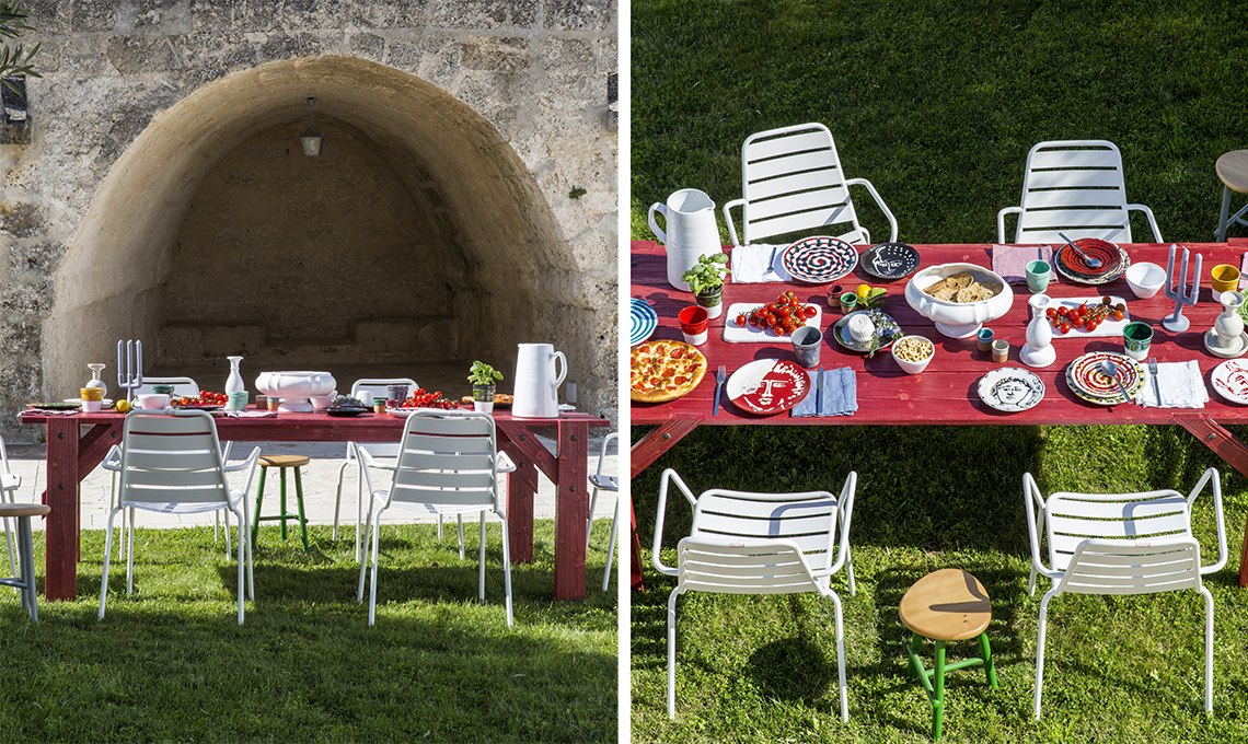 Sulla tavola, luminosa come un’estate mediterranea, esplode la variopinta raffinatezza dei piatti, il cui disegno è una rilettura delle tradizioni [Fasano Ceramiche], con tovaglioli [La Fabbrica del Lino], posate e portacandele [Bitossi Home].
