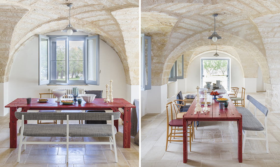 Sul tavolo Officina [Mogg], alzate, piatti e portacandela [Fasano Ceramiche] sono un omaggio alla tradizione pugliese. A sinistra nella foto, le sedie Pelleossa e Valerie [Miniforms, da €470 e €506], precedono la rivestita Ghost 23 [€374] di [Gervasoni] come la panca Brick 215 [€1.184].
