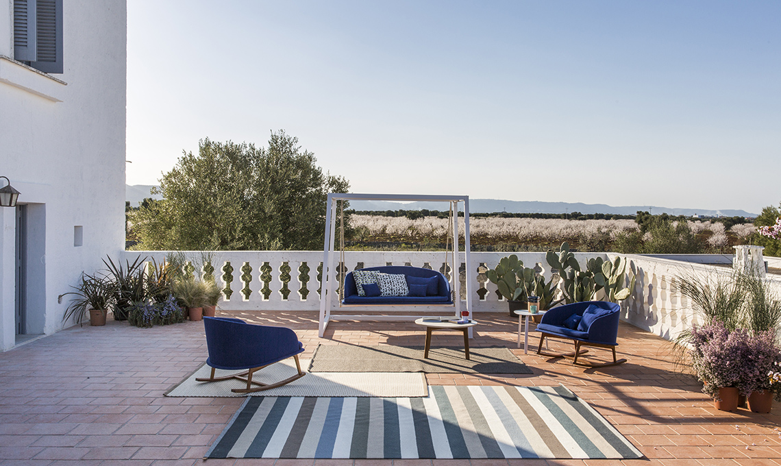 Il divano sospeso e le due poltroncine a dondolo Cleo [rispettivamente da €8.784 e da €2.196] sono l’ideale per i pomeriggi pigri. Da notare il blu