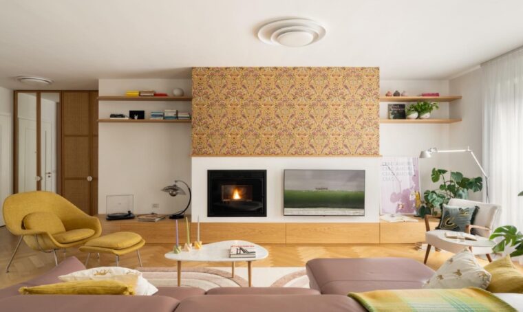 del pavimento Heritage Exagona Decò [Fioranese]. Sul piano libri, piante, vasi [Fasano Ceramiche] e una lampada moderna [Renzo Serafini].