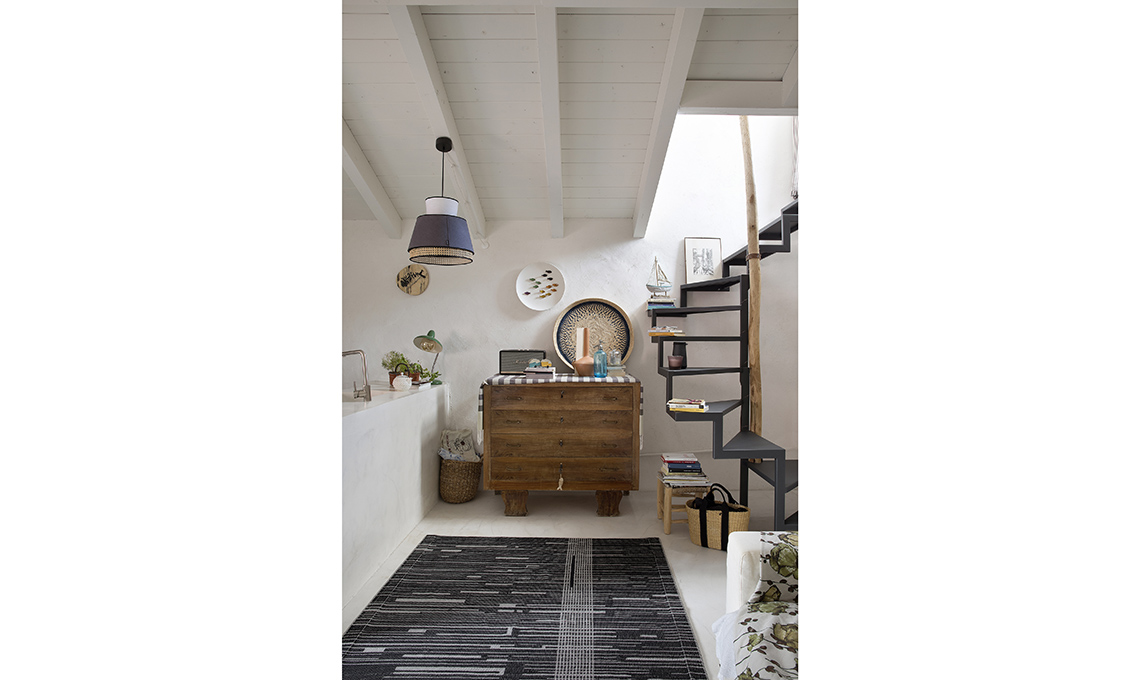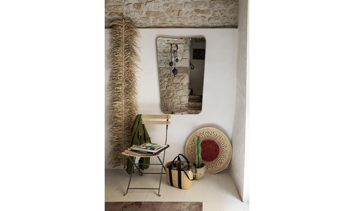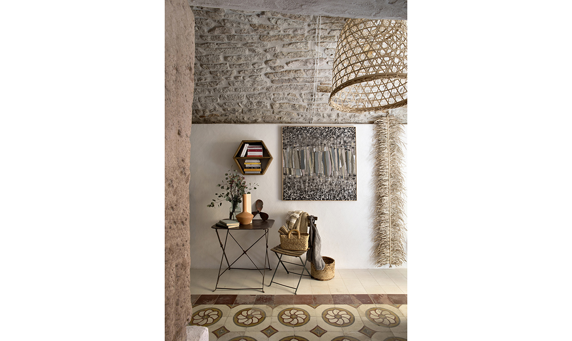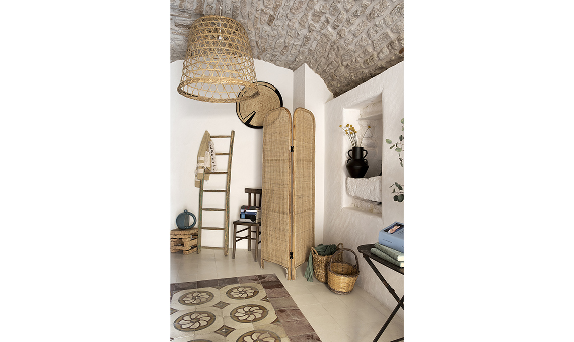 Il décor ha sempre un che di spontaneo e naturale, dalle ceste contadine alla scaletta, dai vasi di forma austera al séparé in paglia.