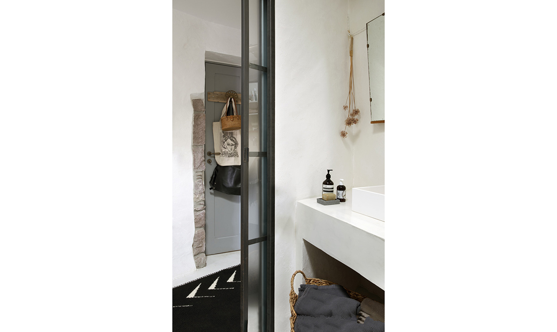 A quelle in legno, di recupero, si accosta la porta del bagno realizzata in ferro e vetro satinato da un fabbro locale.