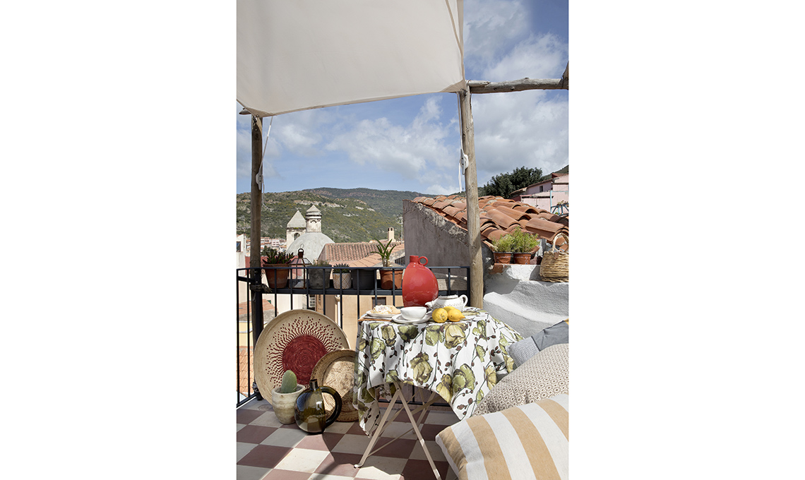 Per ombreggiare il terrazzo Angelo ha pensato a una sorta di vela: «La struttura è costruita con dei legni che ho trovato in spiaggia, canne di bambù e del cotone marino per le barche». All’orizzonte, si vedono le 600 torrette che fanno di Bosa un piccolo presepe multicolore.