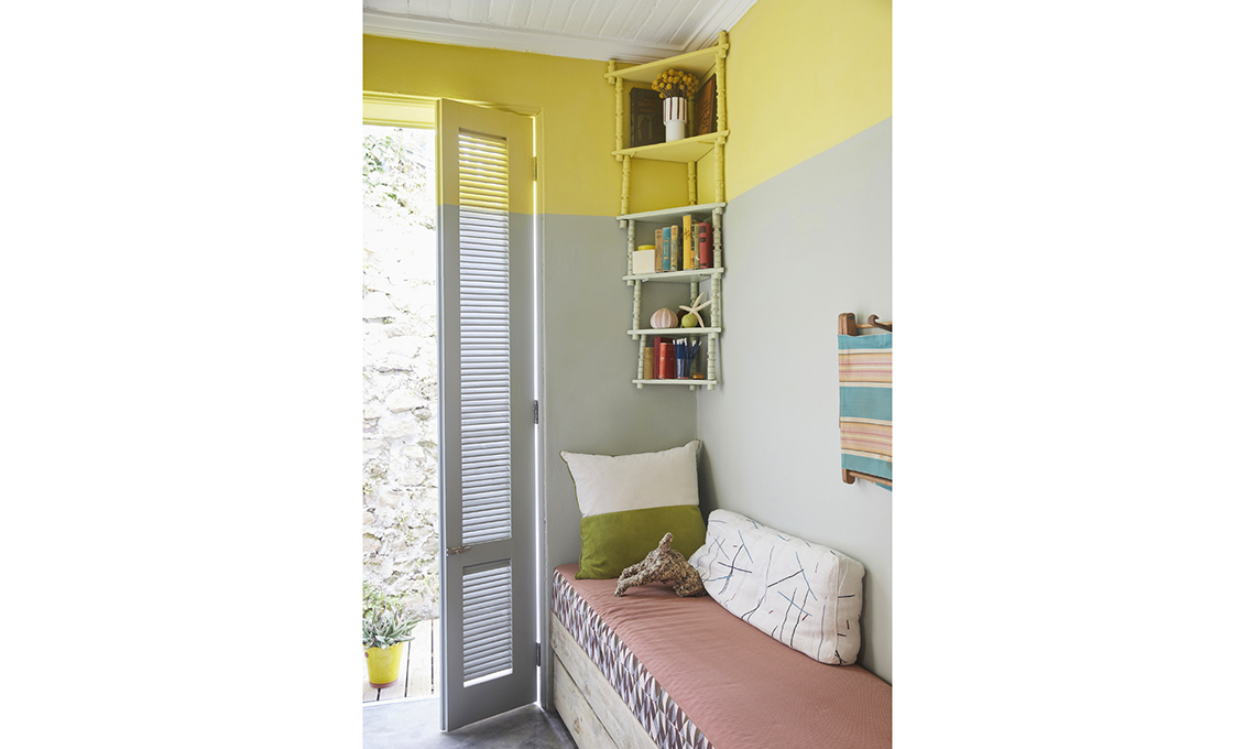 Una delle camere degli ospiti è stata attrezzata per i bambini. I letti small sono concepiti come le cuccette di un treno. Le persiane, colorate di grigio caldo e giallo cedro come le pareti e la libreria, fanno décor.