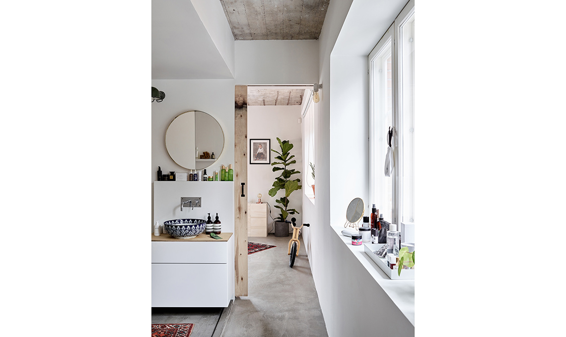 Quando ci si inoltra al piano superiore, il non-colore per eccellenza riesplode in tutta la sua nordica veemenza in un bianco totale. Che si tratti di un angolo relax, dell’ampio bagno padronale o di un’infilata di porte capaci di sostituire un tradizionale corridoio, il fondo candido sembra far risaltare oggetti ed elementi architettonici come in una moderna galleria della quotidianità. Le piante e gli immancabili tappeti contribuiscono a costruire lo charme di un’ambiente che rilegge la tinta più luminosa senza mai rimarcarne il tono più freddo e impersonale.