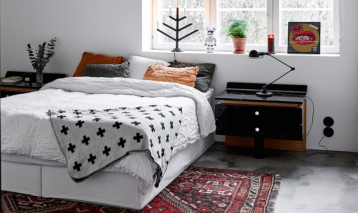 I mobili della tua camera da letto sono neri? Fai come Nita, rendi tutto più grafico e moderno. Per esempio, aggiungendo l’espressiva lampada