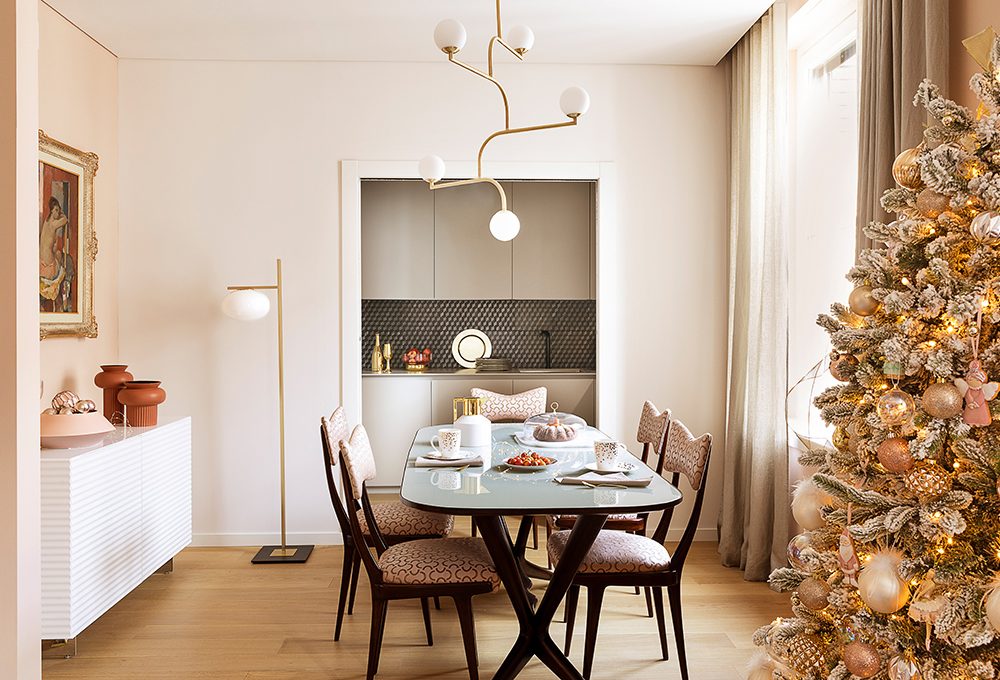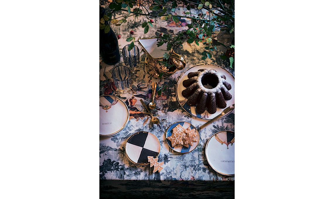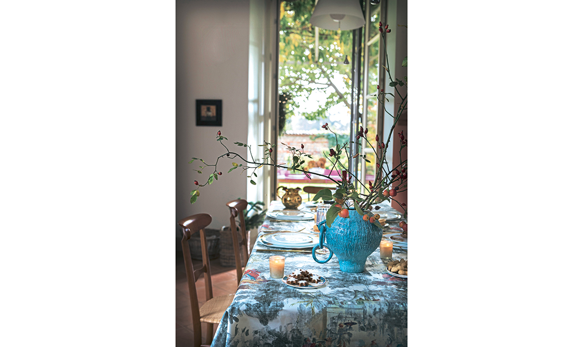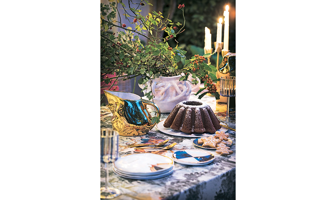 Sopra il top della cucina su misura [CA Arredamenti], bicchieri e caraffa bordo oro [Croff], panettone [T’AMilano], vaso bianco [Heartista Studio], sedie Campanino Classica [Fratelli Levaggi], sospensione Costanza [Luceplan]. A tavola, tovaglia in tessuto Déjeuner Sur l’herbe [Rubelli], vaso azzurro [Heartista Studio], piatti e vassoio Araldica [Vetrofuso], posate, candele e candelabri [Croff], calici Loos e brocca Torcello [Tuttoattaccato], bicchieri Ripple [Ferm Living da Arcarreda], vino Rosso Col Sandago [su hausbrandt.it].