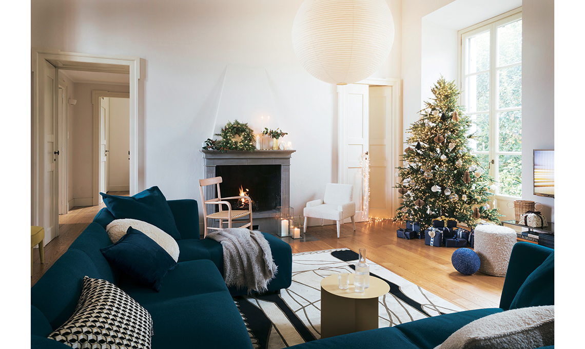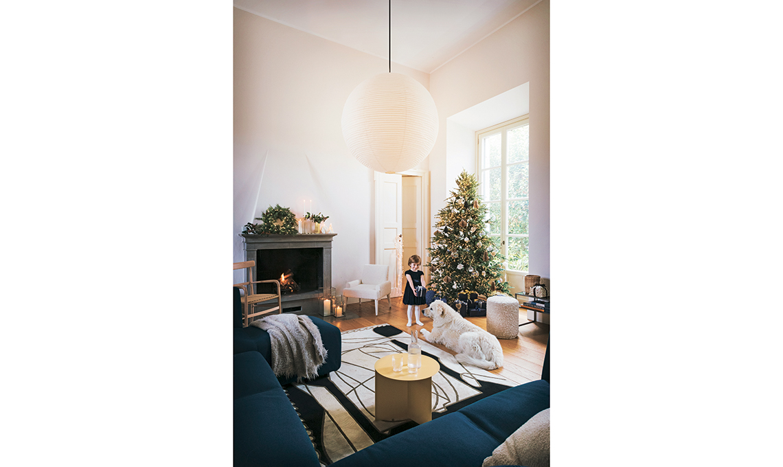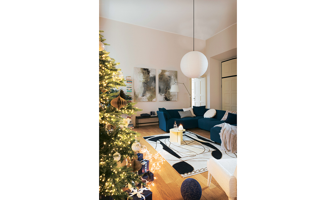[Fratelli Levaggi] più candele e portacandele in vetro [Croff]. Accanto all’albero con decori in vetro e carta [Croff], pouf bianco e sfera blu [Élitis], panettone [T’A Milano], cesti in vimini [da Arcarreda]. Davanti al divano, tappeto annodato a mano Le Ragazze [Karpeta, cm 170x240], tavolino Slit giallo [Hay] con brocca e bicchieri Ripple [Ferm Living] tutto [da Arcarreda].