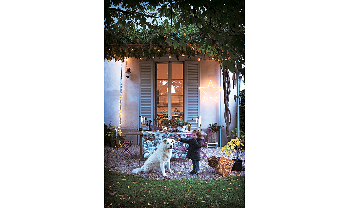 Il tavolo in teak è abbinato alle sedie pieghevoli viola Flower [Ethimo], tovaglia in tessuto Déjeuner Sur L’herbe [Rubelli], candele, candelabri e posate oro [Croff], piatti Araldica [Vetrofuso], vaso bianco [Heartista Studio], bricco Bramante oro e caraffa in ceramica Bauta di [Tuttoattaccato] come i calici Loos. Stella luminosa [Arteleta] e ceste in vimini [Croff]. Gin [Emile Ballor] e champagne [Tanca Brands] distribuiti da [Bonollo].