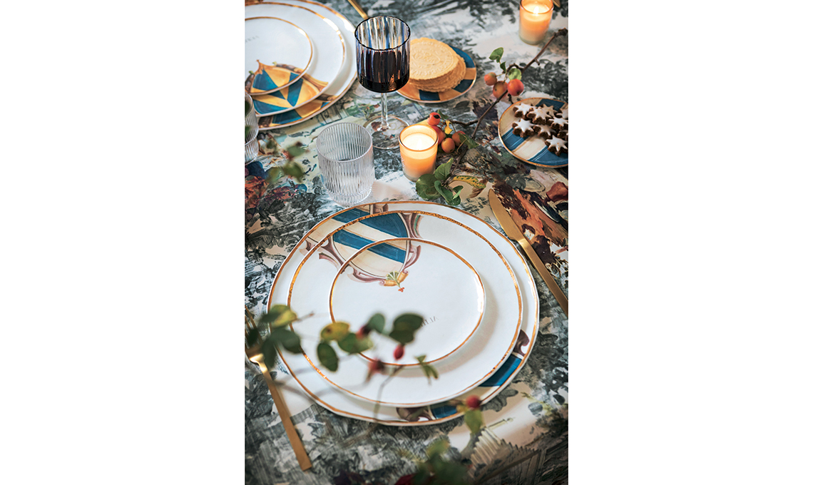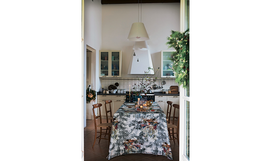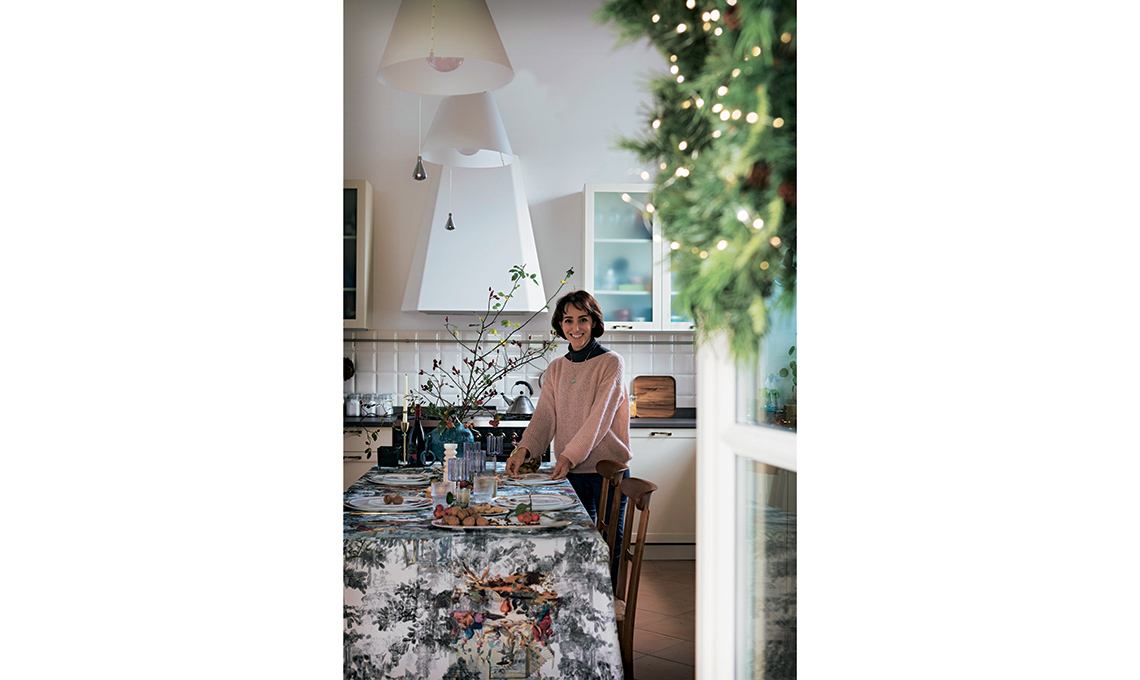 Per la vigilia di Natale Vanessa ha pensato a una tavola che combina la storia della casa con la passione di Alessandra, lo stile nordico: sulla tovaglia Toile de Jouy si mixano piatti con stemmi a posate oro e bicchieri minimal chic.