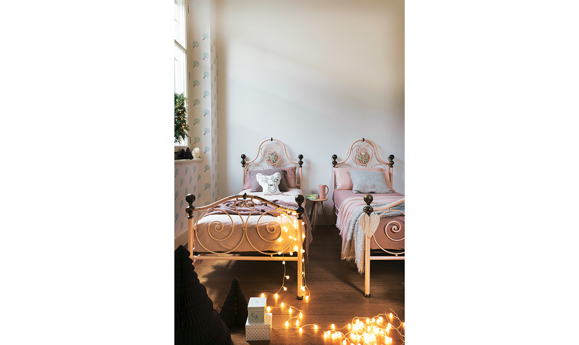 Letti vestiti con lenzuola Nite e Barre color verbena, federe Barre e Peach, cuscini d’arredo Multi verbena e marmo più plaid Cozy verbena, Single e Multi marmo tutto di [Society by Limonta], cuscino con renna [Smallable].