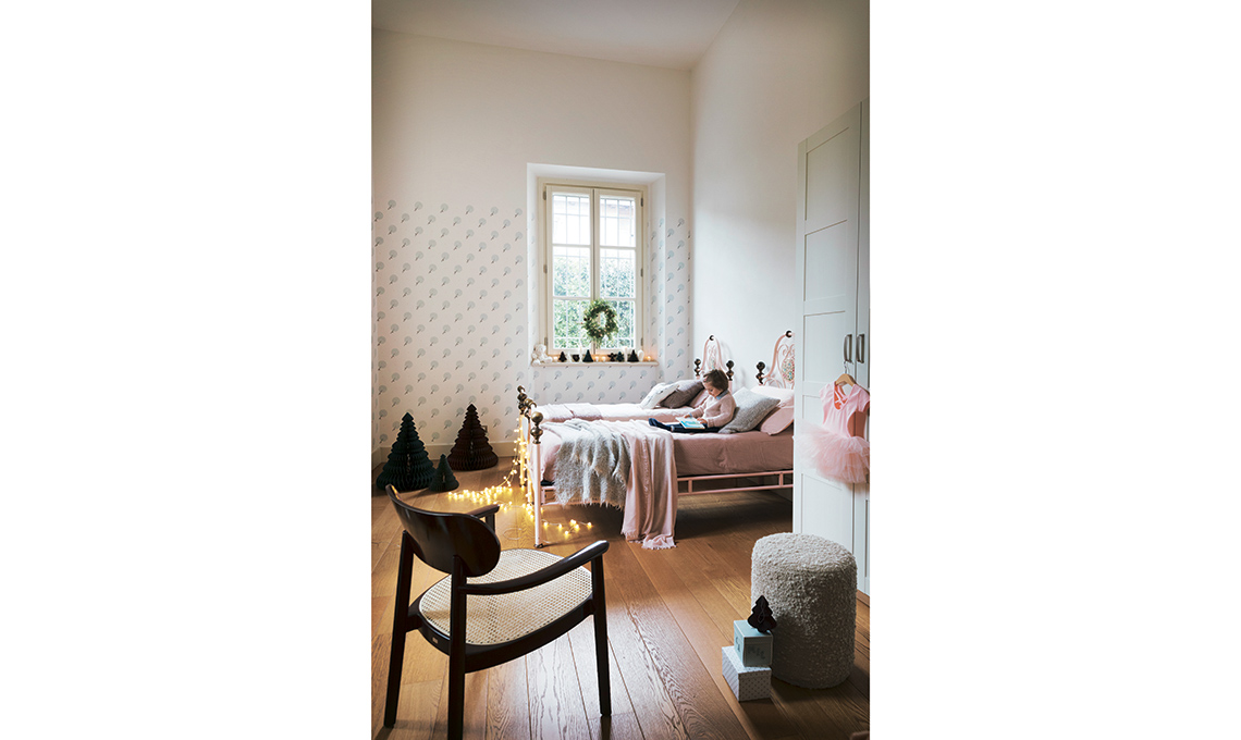 Sul camino, ghirlanda e candelabri [Croff], candele Sculpture e Swirl coll. Nude [&Soul]; ai lati poltroncine in tessuto bouclé [Élitis] e in faggio con seduta in paper cord CH