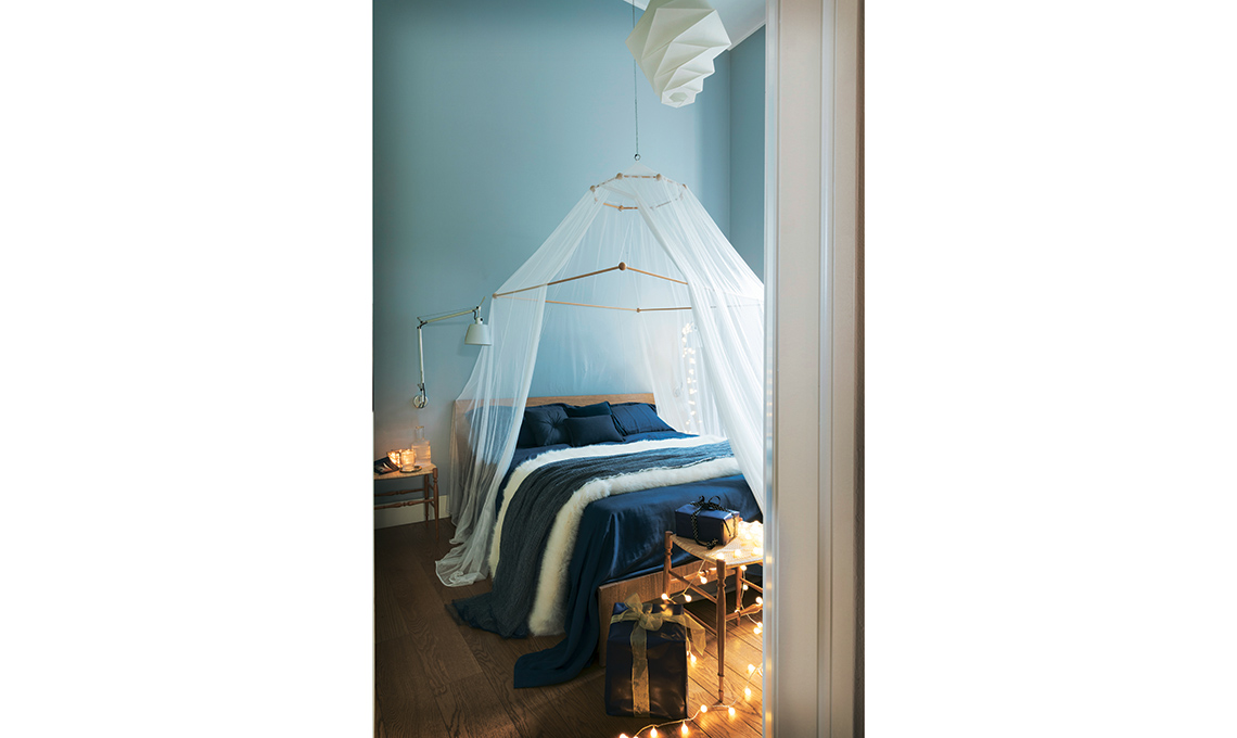 Il letto è vestito con set lenzuola in lino Mykonos indaco,copriletto Rossi più cuscini d’arredo Dueville [cm 40x40], San Nazario [cm 40x40] e Thiene [cm 30x40] tutto di [Lanerossi], plaid Husky Throw [Zinc Textile]. Applique Tolomeo e sospensione Fukurou IN.EI [Artemide], poltroncina in faggio CH2 [Fratelli Levaggi].
