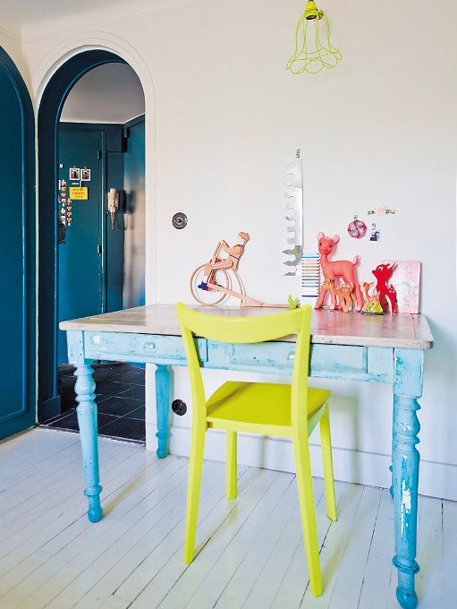 Al tavolo da pranzo, assemblato con materiale da bricolage, sono abbinate piccole sedie scolastiche: tutto si rivela curiosamente “basso”, per porre genitori e figli sullo stesso piano... e ridefinire (in meglio) le proporzioni della stanza. Se ami i contrasti (oppure gli accordi) di colore, gioca con le superfici “parallele”: per esempio, il top giallo e il parquet carta da zucchero. Così massimizzi il risultato.