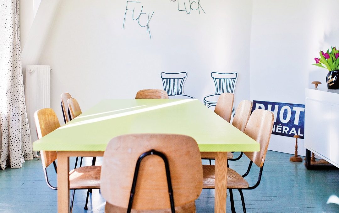 Anne Hubert sorride al fotografo con il suo viso simpatico, pulito, un po’ furbetto. E quasi non ci si accorge che indossa un paio di pantaloni esattamente in tinta con il piano del tavolo: «Amo i dettagli e i colori “acidulés”, leggermente acidi» spiega con un occhiolino. Non a caso il suo progetto di lavoro si chiama “La ciliegina sulla torta”. Come il tocco finale, quello che fa la differenza. Vuoi scoprire tutte le “cerises” del suo appartamento?