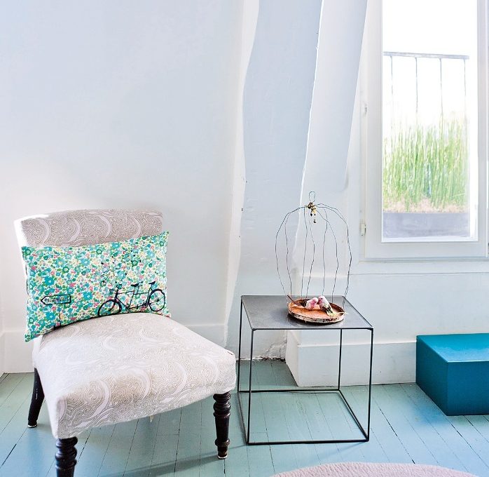 La seduta vintage “rubata” a casa di amici, e poi reinterpretata con un raffinato tessuto Dominique Picquier, sembra perfetta per accogliere uno dei cuscini preferiti di Anne (Tandem liberty, cm 30x50 €37). Accostamenti senza limiti di epoche o stili.