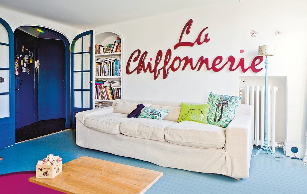 L’insegna in corsivo di un negozio di tessuti dismesso giganteggia sulla parete come un omaggio alla passione di Anne: evocativa, rétro, ma anche terribilmente d’effetto. Proprio come le sue creazioni. Divano Habitat, lampada frutto di una rivisitazione home-made.