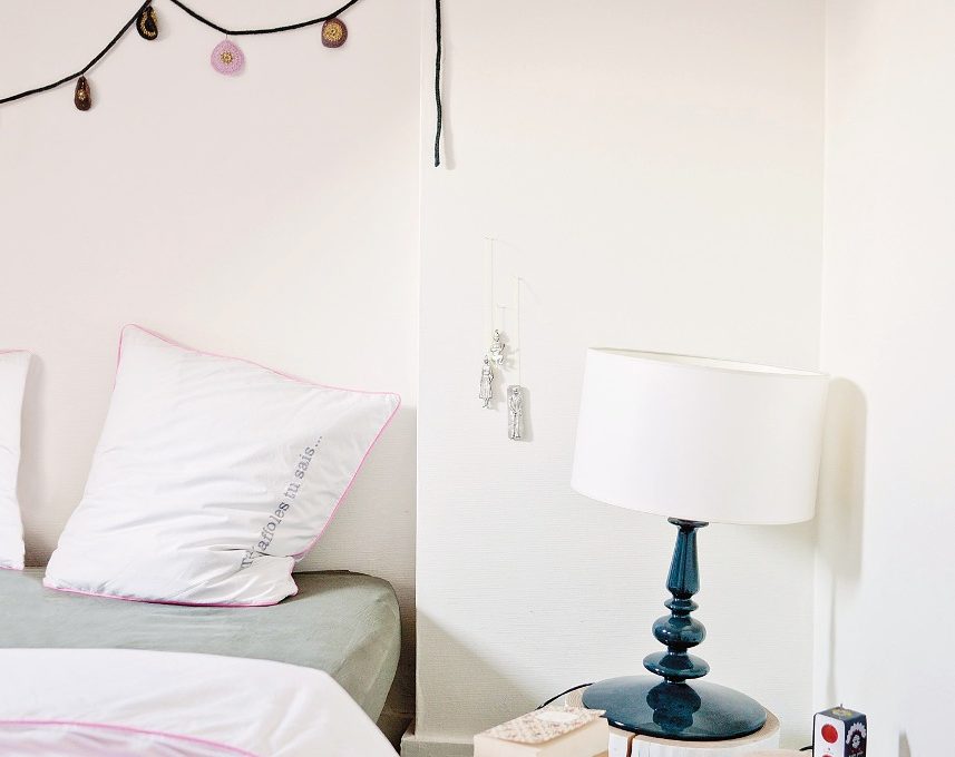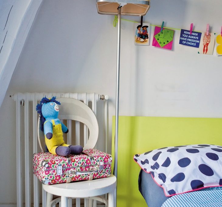 Spensierati e appariscenti, sulla testiera pendono lievi alcuni disegni naïf, fermati con fili e mollette altrettanto briosi. Intorno, il pupazzo e la valigia infantile sposano una sedia di recupero “da grande” in un mélange di suggestioni.