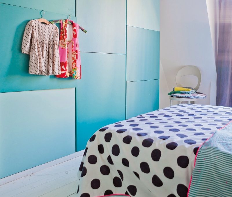 Qualcuno è ancora convinto che l’ordine implichi rigorosa tristezza? Stupiscilo con un mobile così: tanti mega-pannelli (ma bastano piccole ante e classici cassetti) verniciati nei toni dell’acqua. Razionale e luminoso. Quando temi di acquistare mobili troppo impegnativi, prendi spunto da Anne, senza dimenticare il coordinamento cromatico: fra bolli neri e profili fucsia, sul set di lenzuola (Pois grey Pink) spuntano righe in tono con l’armadio.