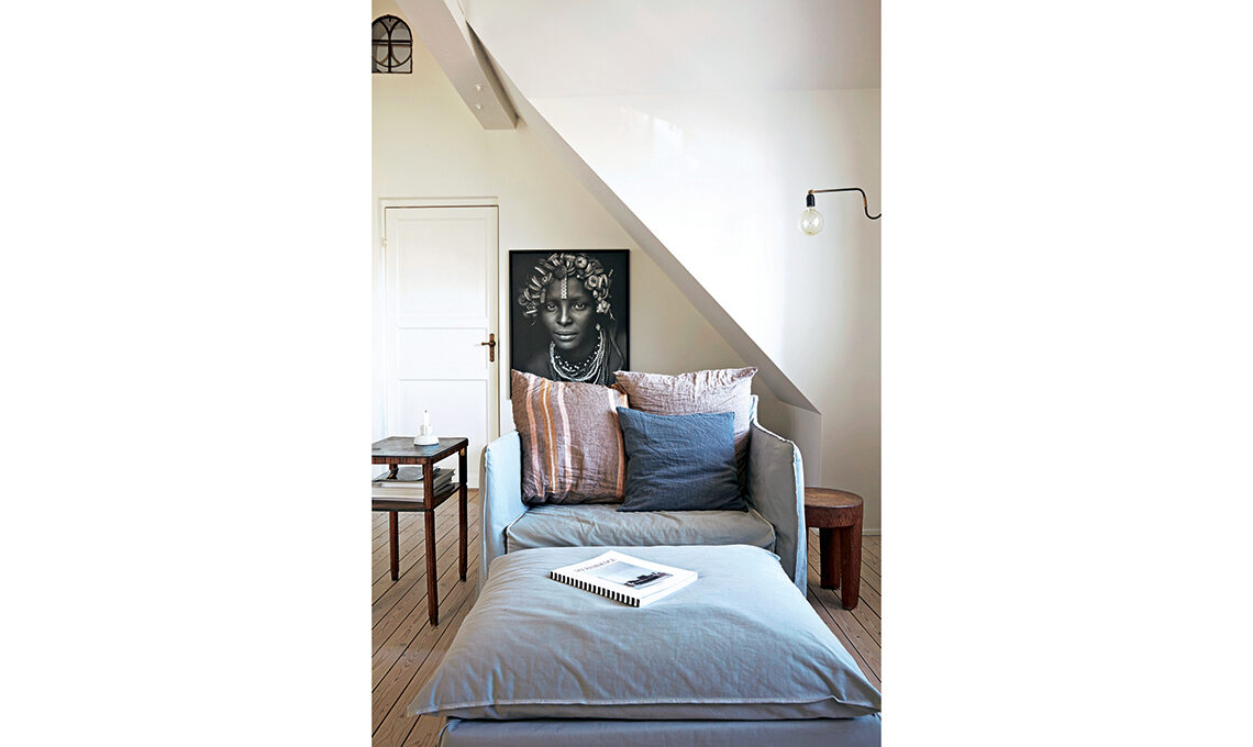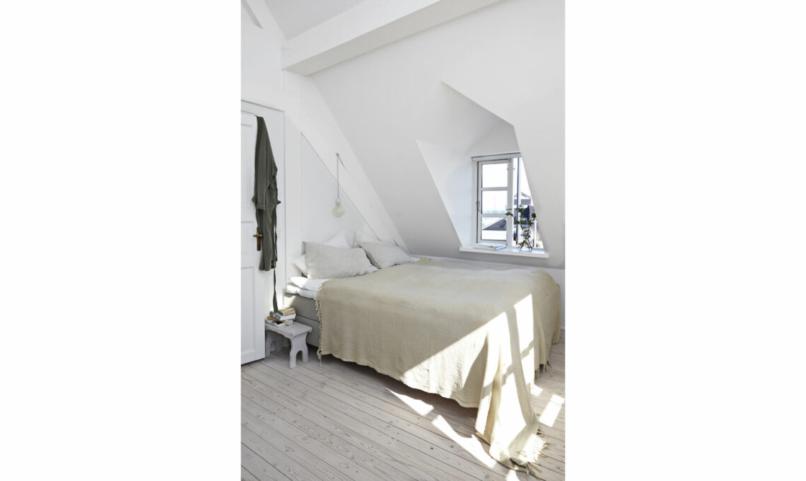 I soffitti a falda e la biancheria di lino a tinte soft fanno l’atmosfera leggera e ventilata. Il pavimento, composto di assi di legno inchiodate, ricorda le ’cabane’ che si trovano sulla spiaggia o i legni sgrezzati dal moto ondoso delle maree. Un modo personale per portare il tema marino senza ricorrere all’azzurro...