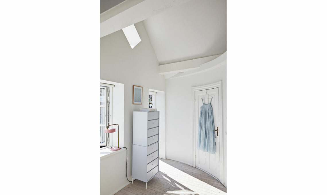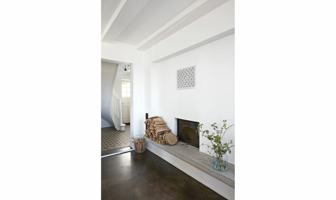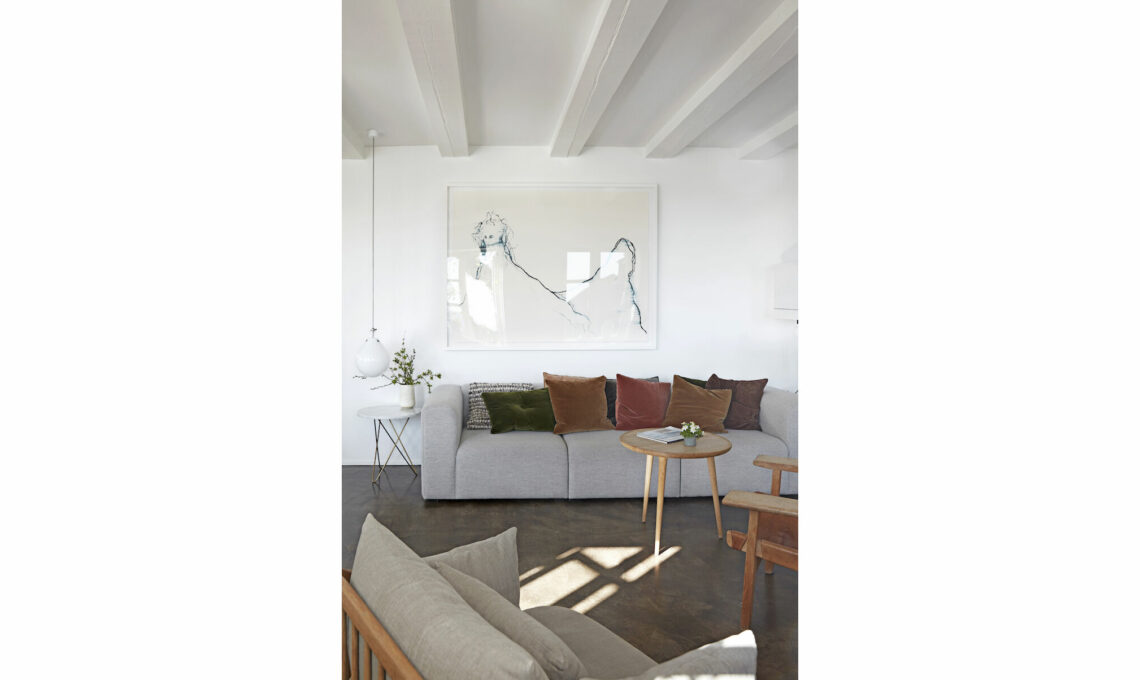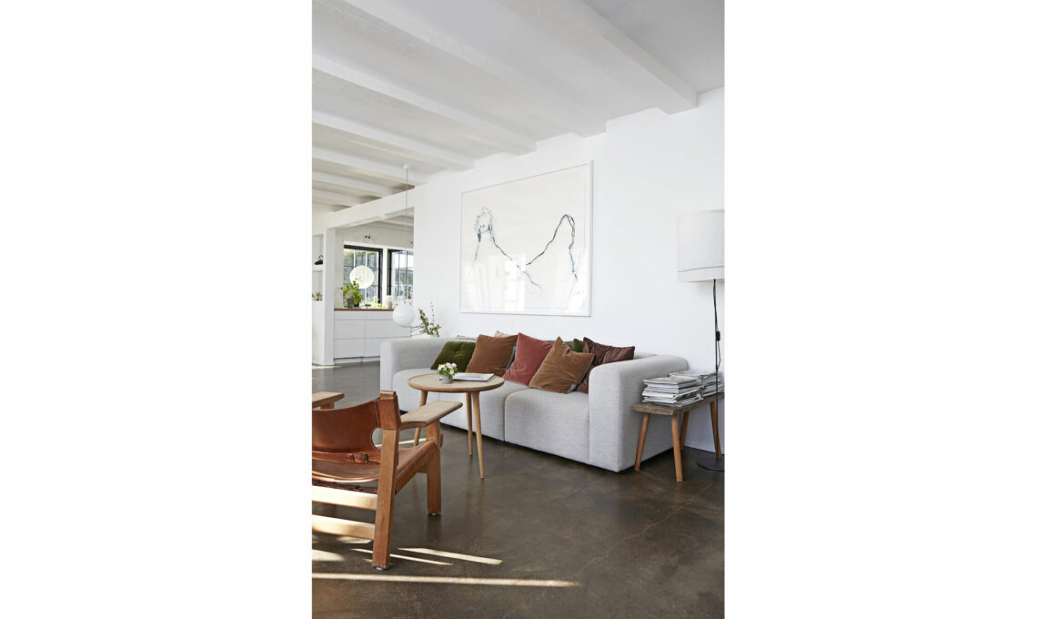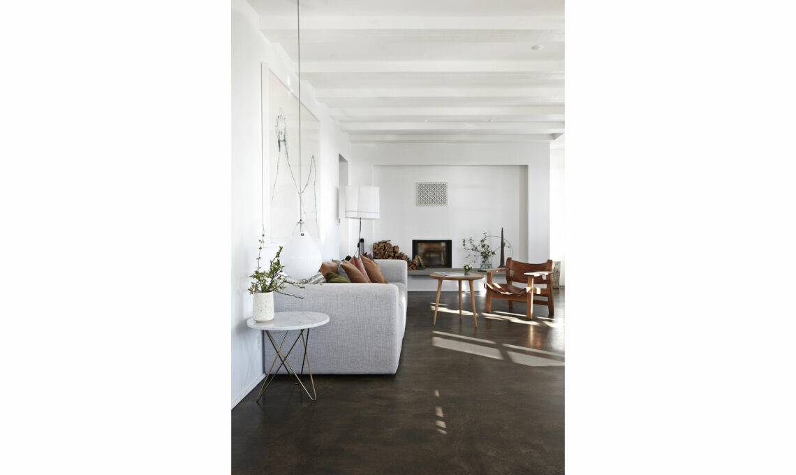 Le travi a vista, verniciate con uno smalto lucido, e i pavimenti di calcestruzzo, rifiniti da uno strato di resina epossidica, visti in prospettiva con il camino offrono una cornice elegante per le opere di Cathrine Raben Davidsen e il raffinato mix di pezzi d’arredo.