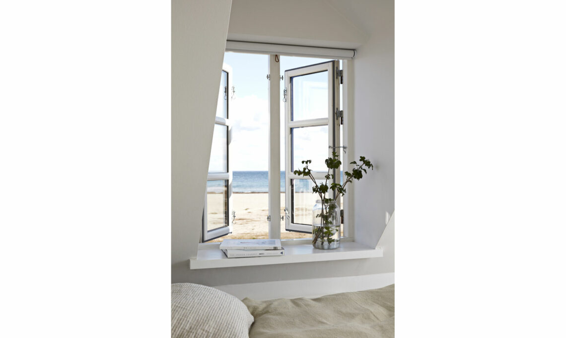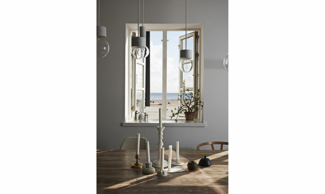 Alle finestre da cui si guarda il mare fanno da contrappunto tante piccole installazioni poetiche: il verde ai davanzali, arrampicato tutto intorno alla cornice, un gruppetto di luci che alternano altezze e dimensioni (seguine l’ordine sfalsato!) e un altro, altrettanto assortito, di candele e candelieri. Copiale a casa!
