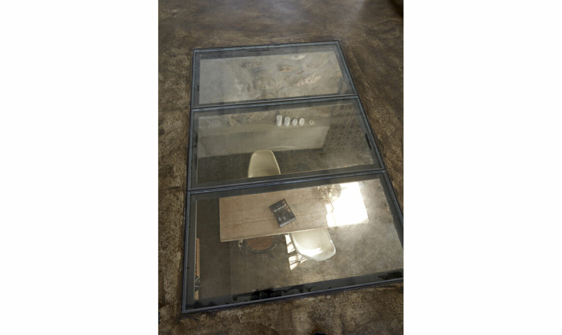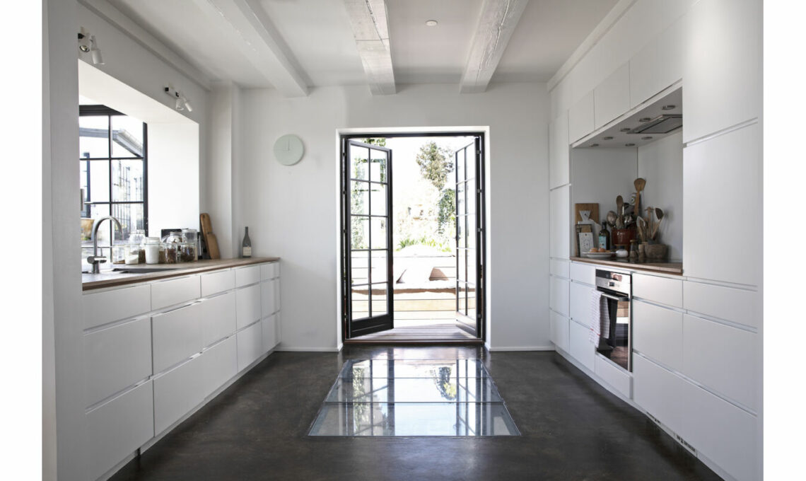 I pezzi della cucina sono stati montati lungo le pareti, sviluppando una composizione a binario che offre il retro alla stanza contigua:così si crea una sorta di penisola tecnica, innestata tra i due spazie le cornici di pilastri e muri portanti. In basso, attraverso il pavimento, la vista si affaccia sulla cantina della famiglia.