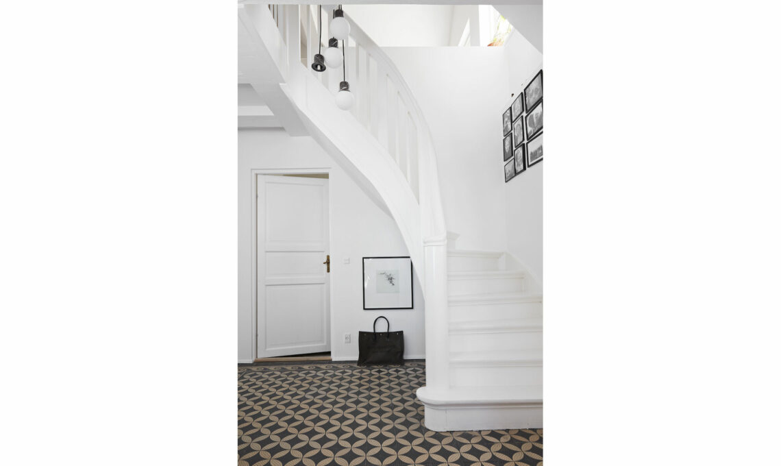 Per far svoltare le sorti decorative di un ingresso concepito come spazio a sé, basta soltanto un pavimento diverso che emerge visivamente e diventa la quinta parete della stanza. All’ingresso, lampadario Mass Light [&Tradition].