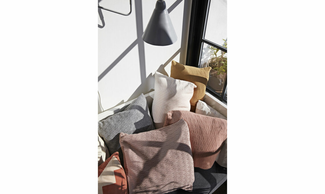 Seleziona almeno due misure e due forme per i cuscini del tuo divano. Cuscini [Aiayu] e luce a braccio simile a Dione [Kave Home €69].