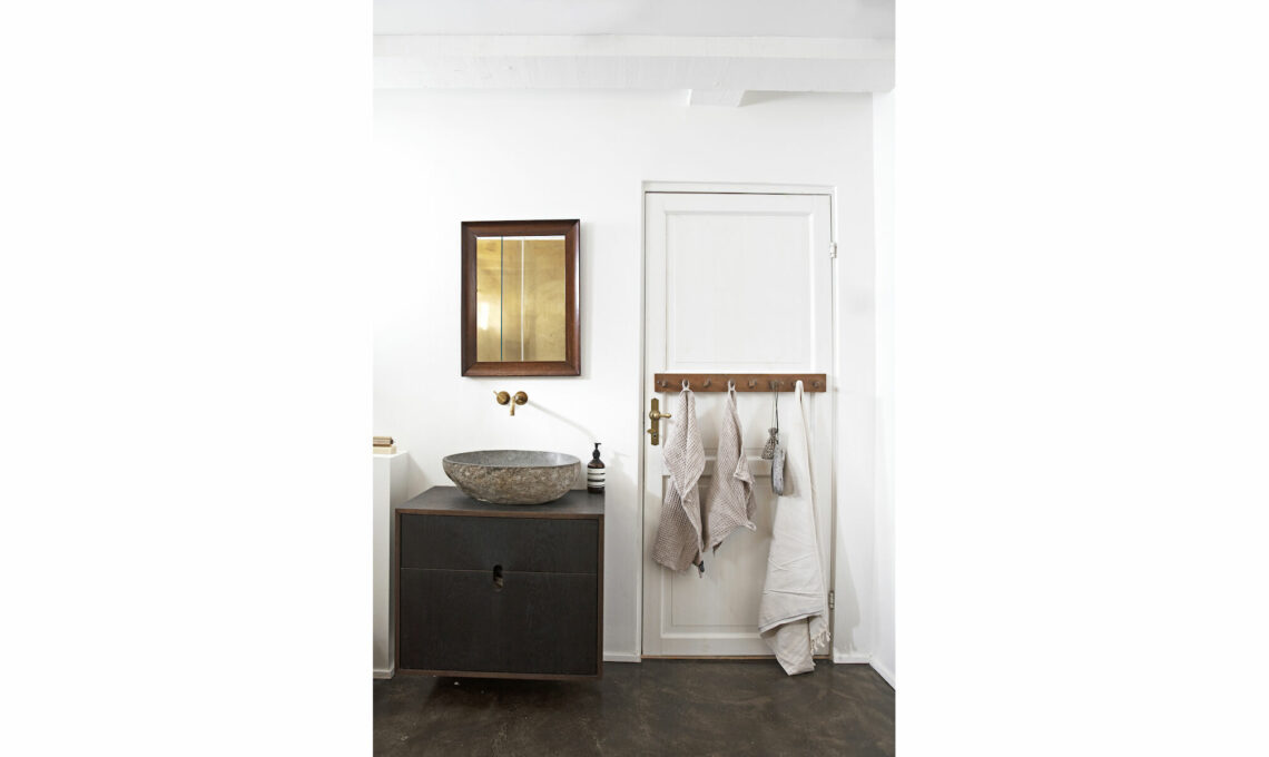 Su lavabo di pietra bocciardata e mobile in metallo. L’appendiabiti vintage è inchiodato direttamente sulla porta.