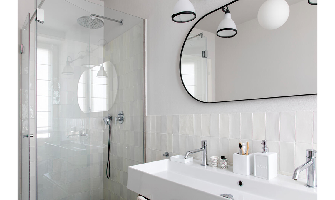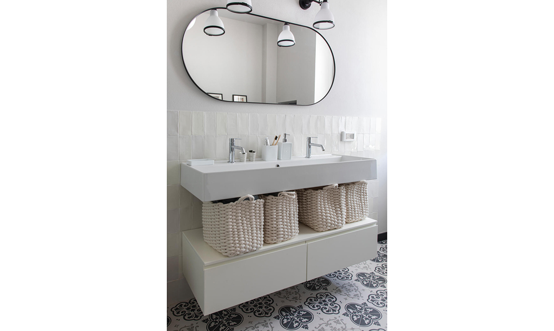 Lavandino Zero [Catalano], mobile realizzato da [BF di Flavio Brivio], rubinetti [Zucchetti Kos], piastrelle parete Hops [41zero42], specchio Lindbyn [Ikea], lampade [DCWéditions], cestini in cotone riciclato bianco [Maisons du Monde].