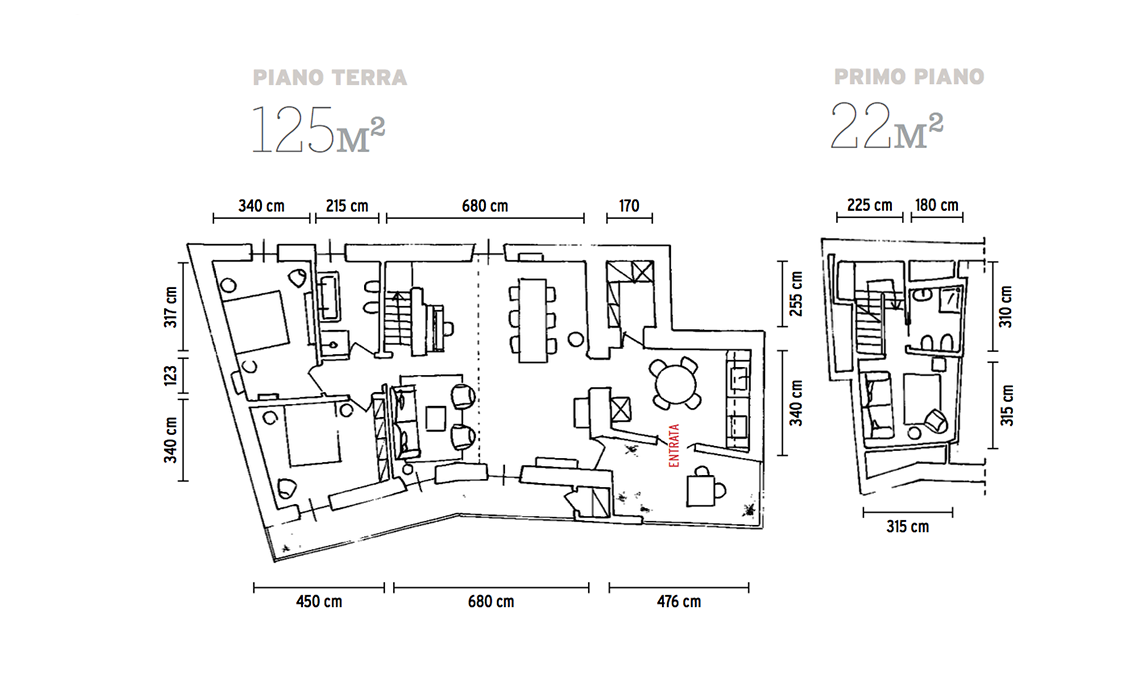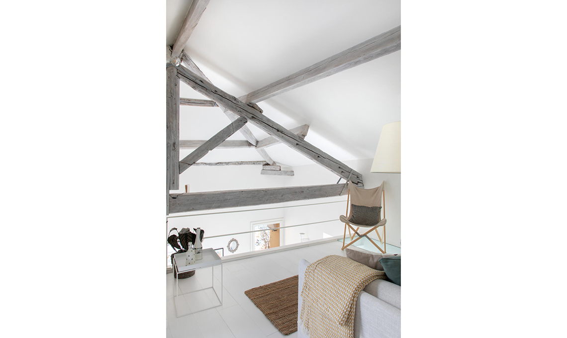 Eliminata la parte del solaio che insisteva sopra l’attuale sala, si è ottenuta una doppia altezza che dà respiro al volume architettonico della casa e alla terza camera della porzione rimasta intatta.