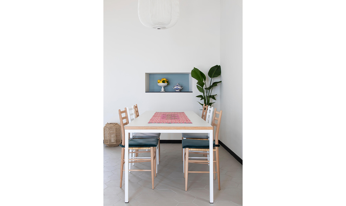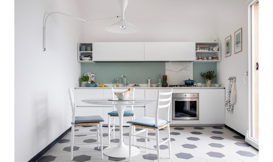 A pavimento, piastrelle esagonali Paprica, in grès [Marca Corona], cucina [Modulnova], sedie mod. Gobbetta [F.lli Levaggi], tavolo Saarinen [Knoll], lampada a braccio Lampe de Marseille [Nemo Lighting € 878,40], centrotavola sotto il mortaio [MariaVi], appendino [Suede Home Collection by Clara Bona]. strofinacci [Linen Tales].