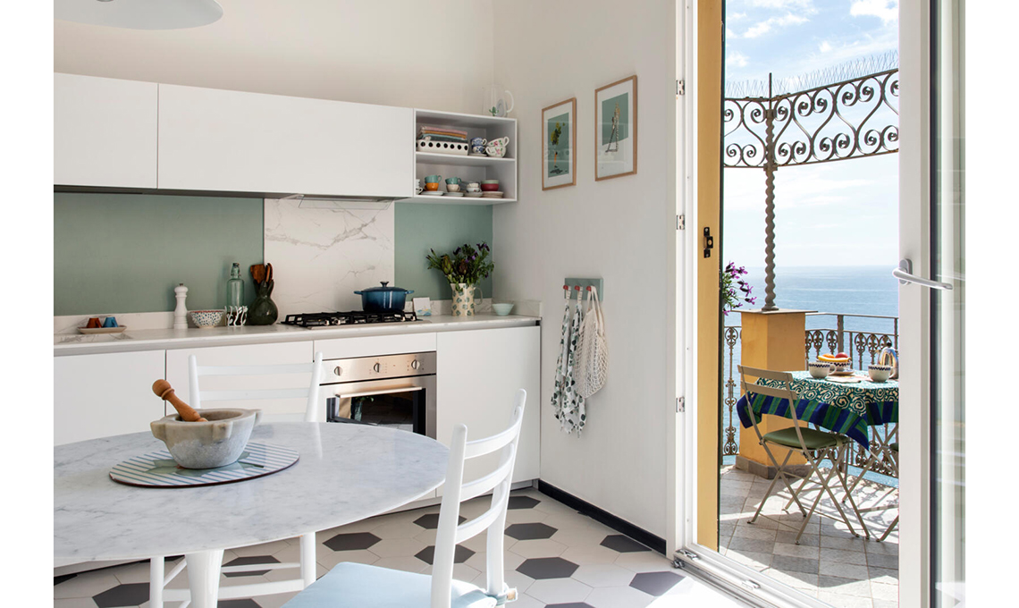 Su arredi e materiali, semplici e lineari, è intervenuta l’architetto Clara Bona di Studio98. Il tutto bianco, animato qua e là da qualche punta di colore, è perfetto per rendere le viste verso il mare le vere protagoniste del progetto.