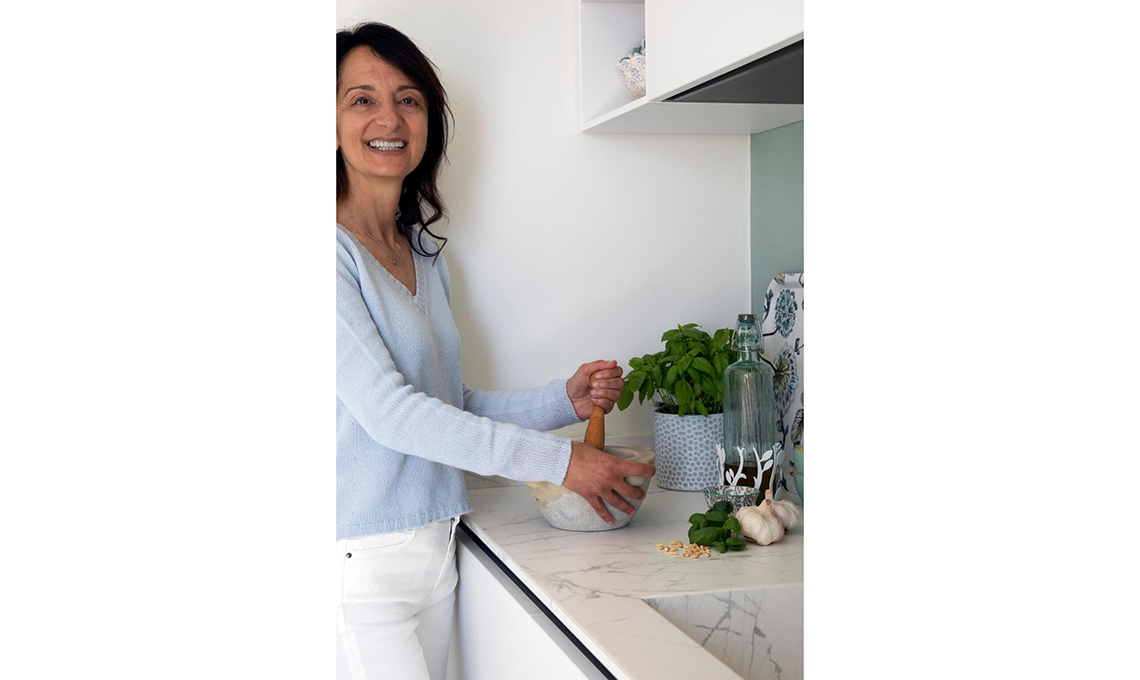 Per il pavimento, Clara Bona ha fatto una scelta uniforme: tutta la casa è stata rivestita con piastrelle in grès esagonali, in una tonalità di grigio chiarissima, da sembrare quasi bianca. Solo nella cucina (e in bagno, con un motivo a decoro) ha aggiunto delle tesserine scure, per comporre il tipico scacco bianco e nero ligure. In foto, la proprietaria Lara Lercari.