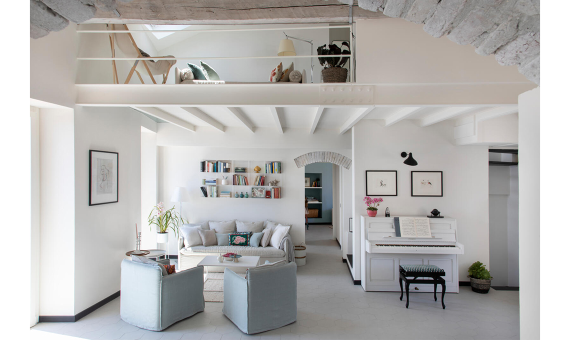 Il pianoforte ridipinto da una decoratrice con smalto ad acqua, si integra nel mood ‘all white’. Altri trattamenti sono stati previsti per putrelle, assi e mattoncini: vai alle pagine seguenti.