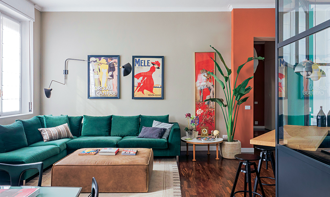 Il tavolino rétro è un pezzo storico (non più in produzione) di Cappellini. Sul sofà in velluto bottiglia i poster originali di Marcello Dudovich solleticano l‘idea del rétro. Se aggiungi una luce a bracci – questa è di [Serge Mouille] – avrai un mix speciale!